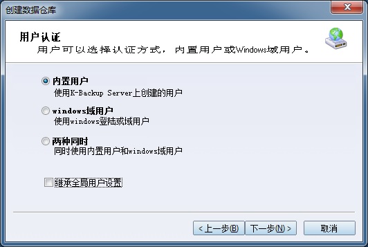 配合客户的服务器环境,我们选择内置用户,并且不继承全局。这样做有一点需要注意,创建完数据库需将用户添加到CHAP认证里面。