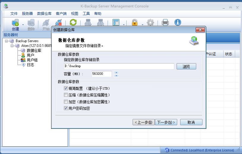 2. 6台服务器暂时分别有450G左右数据需要备份,并且还在增加(从长远考虑我们都分配550G备份空间)。确定好空间后,我们在K-Backup Server创建数据仓库。
